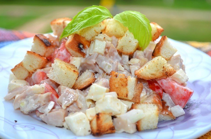 Saláta finom Adyghe sajttal, tejszerű tej ízű, a füstölt csirke és a ropogós kekszet a megfelelő helyre fogja helyezni ünnepi asztal. Készítse elő otthon az üdülésre, vendégek minden bizonnyal érdekli a titka.