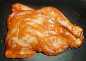 Mossa ki a csirkét, reszelje fűszerekkel és méz keverékével a mustárral.