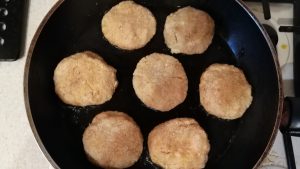 - Nedves kézzel pogácsákat és kenyeret készítünk zsemlemorzsában. Lesz sütjük egy fűtött serpenyőben növényi olajjal. Mindegyikkel oldalán 2 percig.