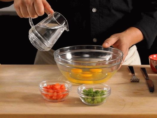 Törje a tojásokat egy tálba, és öntsen vizet. A sütés során a víz elpárolog, ami megkönnyíti az omlett és buja életét.