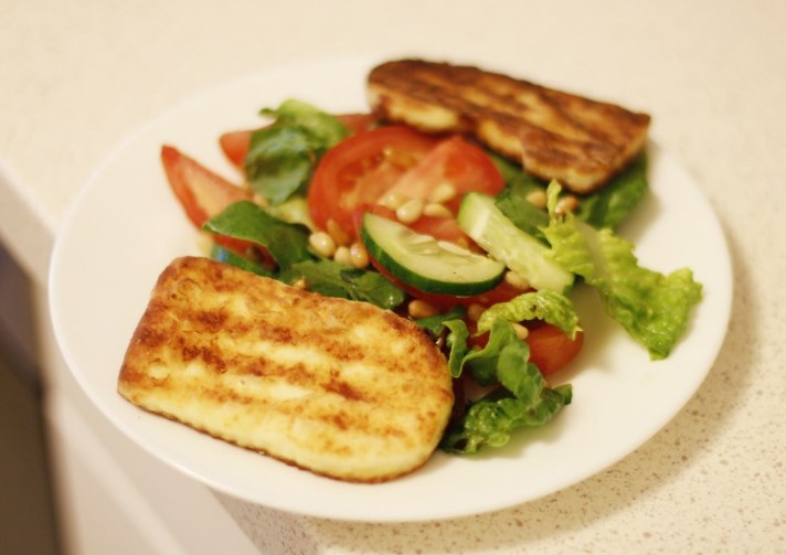 Érdekes recept meleg zöldségsaláta elkészítéséhez otthon. Sült sajt és fenyőmag hozzáadja az eredetiséget. kiadós, finom és egyszerű recept.