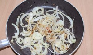 - Ezután vegye le az almát, adjon hozzá olajat, megsütjük a hagymát.