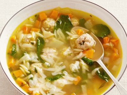 - Főzzük a levest: növeljük a hőmérsékletet, és forraljuk a levest forraljuk. Adj hozzá orzo pasztát és főzzen 6 percig. Adjunk hozzá húsgombócot és főzzük, amíg fel nem tűnnek, még kb. 4 percig. Keverjük össze spenótot és főzzük, még kb. 1 percig. Öntsön levest húsgombóc tányérokra és meghintjük parmezánnal.