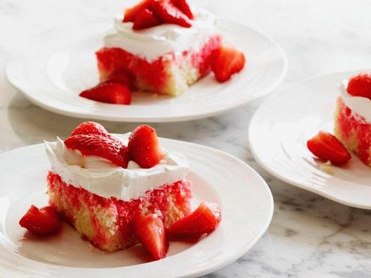 Ez az egy népszerű desszert mérsékelten édes írótorta és kissé édesített tejszínhab. A pite a legjobb enyhén enni hűtött: miután kivette a hűtőszekrényből, adja meg melegítse fel, miközben tejszínhab felverte a feltöltésre. Клубничный pite