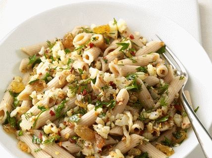 Recepte a karfiollal főtt Penne tészta – Szicíliai. Nagy káposzta reszelt és rántott káposzta mazsola és fokhagyma. Ezután keverjük össze penne tésztával és pecorino sajttal Romanót citromlével meghintjük, parmezánnal meghintjük. egy adag értéke: (összesen 4) Kalória 414, összes zsír 10 g, telített zsírok 1 g, fehérjék 16 g, szénhidrátok 73 g, rost 3 g, 3 mg koleszterin, 143 mg nátrium, 6 g cukor. Ossza meg barátaival: