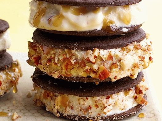 Fagylalt szendvics tökéletes szabadtéri partira Levegő, mert kanál nélkül is elfogyaszthatja, csak a kezében tarthatja. Helyezzen egy kanál fagylaltot a süti két fele és a sütés közé раздайте вашим гостям.