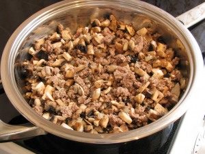 - Összegyűjtjük edényeinket: tedd az alsó réteg felét hús és gomba töltelék.