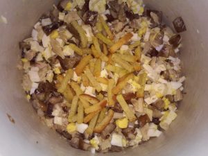- Tegye az összes hozzávalót egy tálba, adja hozzá az apróra vágott tojást és kekszet.