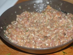 - Csiszolja a hagymát és a fokhagymát egy turmixgépben. Ezután adjuk hozzá őket a darált húshoz. rizzsel, fűszerekkel, apróra vágott petrezselyemmel együtt tojásba helyezzük, és ennyi keverjük össze.