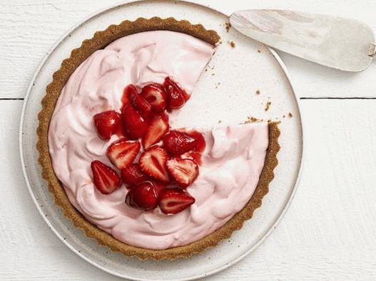 - Körülbelül 10 perccel a tálalás előtt vegye ki a tortát a fagyasztóból, hogy kissé lágyabb legyen. Mikrohullámú zselét be A mikrohullámú tál folyadékáig válik, 20-30 másodperc alatt habverővel sima. Adjunk hozzá eper és óvatosan keverje össze. Hagyja infundálni 10-15 percig. Vegye ki a süteményt az öntőformából, és helyezze át az edénybe. Öntsük át eper öntettel.